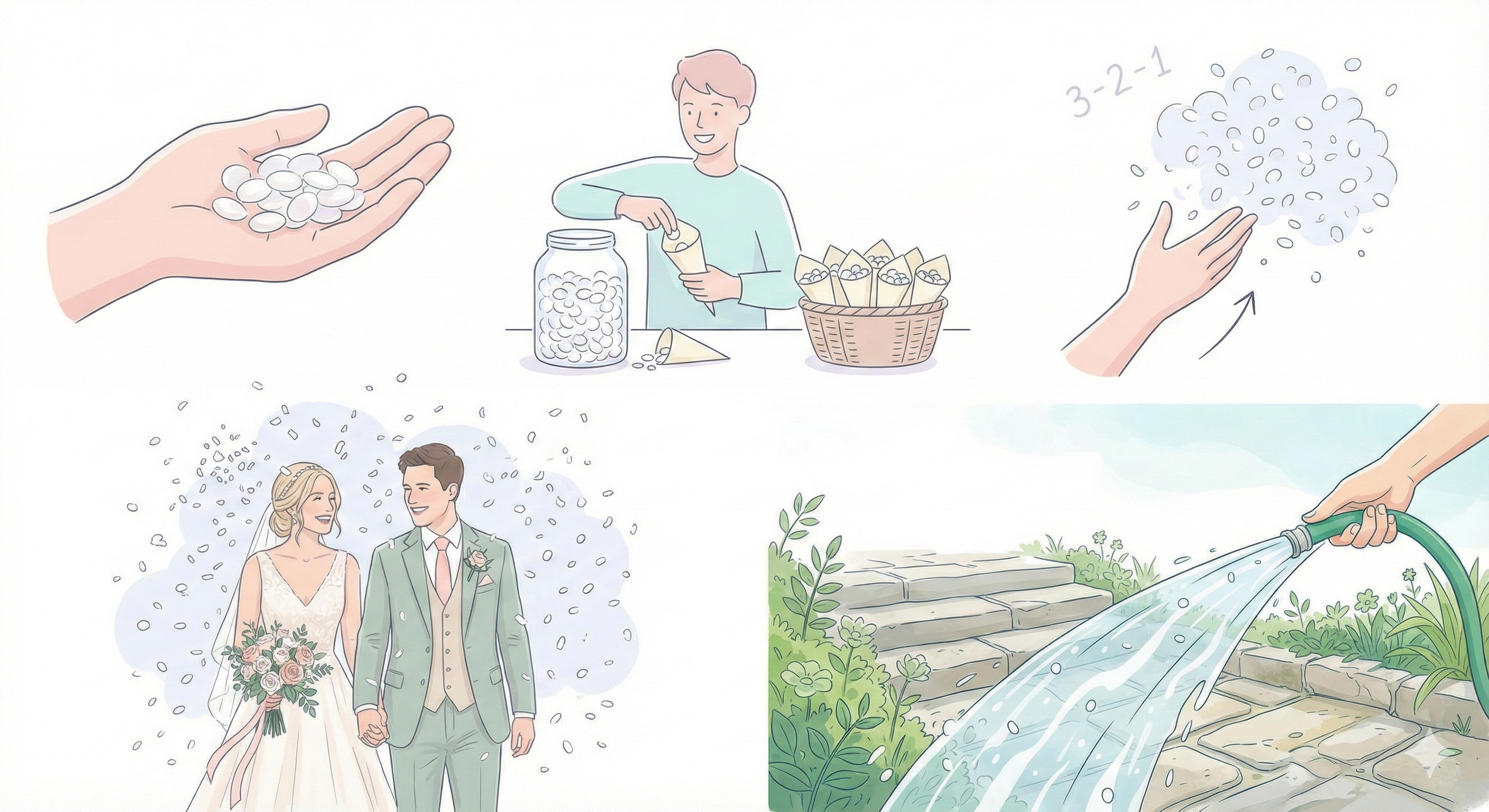 Machen Sie bei Bedarf einen kleinen Probewurf mit einigen Gästen, um zu sehen, wie das Konfetti fällt.